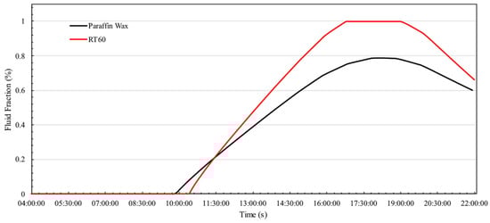 The fluid fraction study in Figure 7 reveals essential information on the thermal performance of RT60 and paraffin wax as phase change materials (PCMs) in a solar water collector. The fluid fraction, which reflects the proportion of the material that has changed from solid to liquid, shows considerable variances in how each PCM retains and releases heat.