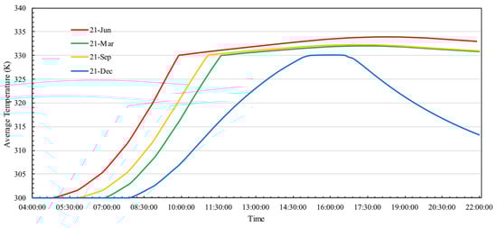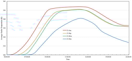 Figure 11 illustrates the seasonal variation in the average temperature of the solar collector system on four key dates: 21 June, 21 September, 21 December, and 21 March, highlighting the system’s thermal performance throughout the year. The June profile peaks at approximately 365 K, reflecting the system’s optimal performance during summer due to high solar irradiance and prolonged daylight. In contrast, the September and March profiles, with slightly lower peaks around 355 K, indicate strong but slightly diminished performance during these transitional months. The December profile, with a peak just above 340 K, underscores the reduced efficiency of the system in winter, attributable to lower solar input and shorter days. The heating period is the longest in June, with a gradual temperature decline indicating better thermal retention, while December shows a more rapid temperature drop, emphasizing the challenges of maintaining efficiency in colder seasons. Overall, the figure highlights the solar collector system’s dependence on seasonal variations, with peak performance in summer and a notable decrease in winter, suggesting the need for optimizations to ensure year-round effectiveness.
