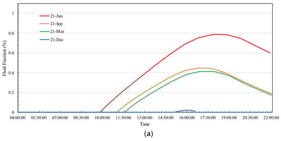 Figure 10 provides a comprehensive visualization of the seasonal and spatial performance of the phase change material (PCM) within a solar water collector system. Figure 10a presents the fluid fraction variations over the course of a day for different dates: 21 June, 21 March, 21 September, and 21 December. The fluid fraction, which denotes the proportion of PCM in a melted state, demonstrates clear seasonal dependence. The system’s performance is maximized in June, with the fluid fraction peaking near 0.9, indicating the near-complete utilization of the PCM during periods of high solar irradiance. Both March and September exhibit moderate peaks in the fluid fraction, ranging between 0.6 and 0.7, reflecting the transitional nature of these months in terms of solar availability. In contrast, the system’s efficiency is markedly reduced during December, where the fluid fraction barely exceeds 0.1, underlining the need for system optimization during the colder months.
