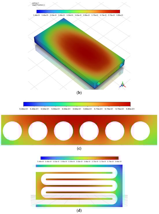 Figure 10b–d provide a spatial perspective on the PCM’s fluid fraction at 18:00 on 21 June, at peak performance. Figure 10b offers an isometric view of the fluid fraction distribution, showing that the PCM melts most effectively in the central region of the solar collector. This suggests a concentration of thermal energy in this area, while lower fluid fractions towards the edges indicate areas where heat transfer could be improved, potentially through better insulation or an optimized collector design. Figure 10c provides a front view of the fluid fraction contour, and Figure 10d shows the top view, with both reinforcing the observation that heat distribution is uneven across the collector surface.
