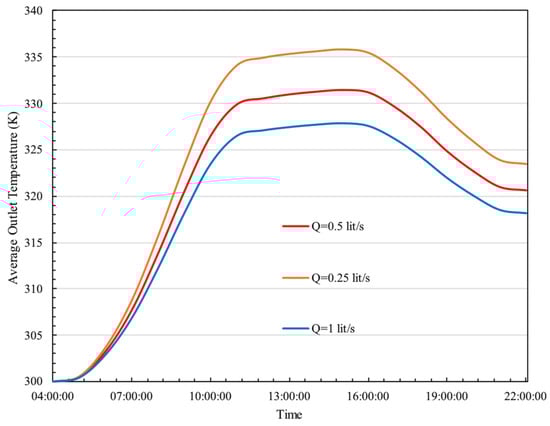 Average outlet temperature variations throughout the day for different inlet flow rates (Q = 0.25, 0.5, and 1 L/s).