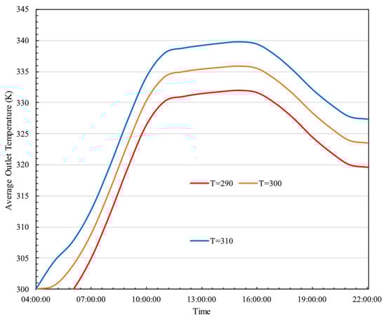 Average outlet temperature variations throughout the day for different inlet temperatures (T = 290 K, 300 K, and 310 K).