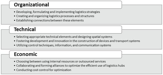 The objectives of urban logistics are complex and include a wide range of aspects that must be coordinated and systematized according to their relative importance. The potential for contradictions and conflicts between individual partial goals emphasizes the need for their clear definition to effectively coordinate logistics activities within the city [13,14,15]. Urban logistics goals can be interpreted through the lens of different types of tasks, including organizational, technical, and economic [16,17,18], as illustrated in Figure 1.