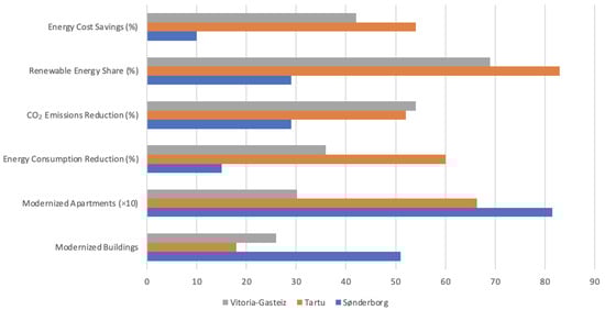 - Energy consumption reduction—Tartu achieved the highest energy consumption reduction of 60%, which indicates the high effectiveness of its modernization efforts. Vitoria-Gasteiz achieved a 36% reduction. Sønderborg, despite the largest number of modernized buildings and apartments, reduced energy consumption by only 15%.