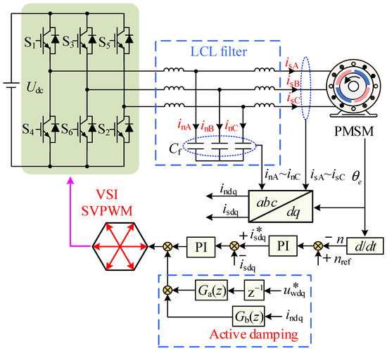 Although the LCL filter can reduce harmonic components, it will result in a resonance problem. The resonance can not only cause current oscillations near the cut-off frequency but also endanger the stability of the control system. As shown in Figure 2, to suppress LCL resonance, an active damping control strategy based on the capacitor current is designed [30]. The experimental results show that the strategy is effective in suppressing LCL resonance within the Nyquist frequency. In Figure 2, isA~isC represents the stator currents; inA~inC is the filter capacitor currents; is the electrical angle of the motor; nref and n refer to the given and actual speed of the motor, respectively; and represent the given and actual current with complex vector form, respectively; indq is the capacitor current with complex vector form; is the output voltage of the inverter; and Ga(z) and Gb(z) are active damping controllers.