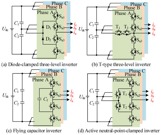 Multilevel topologies have been widely used in high-power motor drives. The number of output levels is increased, output voltages close to sine waveforms can be obtained, and current harmonics can be reduced. Therefore, multilevel inverter topologies are also used in high-speed motor drives. At present, diode-clamped inverters, T-type inverters, flying-capacitor inverters, and active neutral-point-clamped inverters are usually used, as shown in Figure 3.