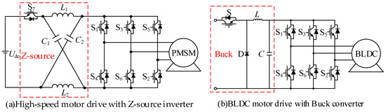 As shown in Figure 4b, when brushless DC (BLDC) motors run at low speed, the Buck converter is employed to reduce the bus voltage for low current harmonics [51]. In [52], pulse width modulation (PWM) and pulse amplitude modulation (PAM) of the high-speed BLDC motor drive system are analyzed and compared, and the results show that the PAM control can effectively reduce high-frequency current harmonics. The current harmonics and losses of HS PMMs at low speeds can be reduced by the inverter with DC bus voltage regulation. But the loss at the rated power point cannot be decreased and a front-end DC converter with the same power is needed.