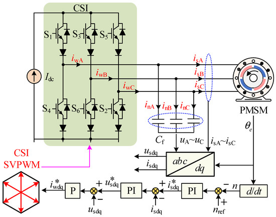 The second-order CL filter is composed of the inverter output capacitor and the motor inductor and can filter out high-frequency harmonics. However, it also introduces a resonance issue associated with the CL configuration. In order to suppress CL resonance, an active damping control strategy based on capacitor voltage feedback is proposed [59]. In [60], the voltage closed-loop controller is employed, as shown in Figure 6, to reduce system order and suppress the resonance peak. iwa~iwc refers to the three-phase current output by the CSI; uA~uC refers to three-phase voltage; ina~inc is the current of the filter capacitors; isA~isC represents the three-phase current of the motor; is the electrical angular velocity; nref and n refer to the given and actual speed of the motor, respectively; and represent the given and actual current in the dq frame with complex vector form, respectively; and and are the given and actual voltage in the dq frame with complex vector form, respectively.