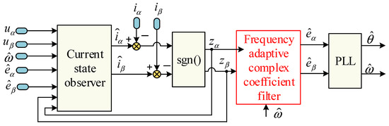 The SMO is a variable structure state observer. In traditional SMO, the error between the estimated and measured stator current is selected as the sliding surface. The motor EMF is extracted by a Bang-Bang-based control function, which also ensures the finite-time convergence of the SMO. Therefore, the SMO has the advantages of strong robustness and a fast dynamic response. However, the traditional SMO has an inherent chattering problem. The application of the switching function will result in a continual switch from the on and off state. Therefore, the saturation function and the high-order SMO were employed to suppress chattering in [69,70]. In order to reduce chattering and eliminate phase shift, an enhanced SMO is proposed in [71]. This method uses a frequency adaptive complex coefficient filter (FACCF) to replace the low pass filter, which can extract back EMF without distortion. Its control block diagram is shown in Figure 7. uα, uβ, iα, iβ, eα, and eβ are the voltages, currents, and back EMFs of axis α and axis β. ω and θ are the rotor electrical angular velocity and position, respectively. The symbol “^” represents estimated values, and zα and zβ are sliding mode control functions. Compared to the traditional SMO, the FACCF-based SMO achieved good estimation performance when the switching frequency was reduced to 600 Hz.