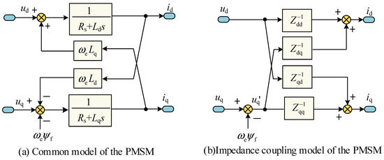 Figure 8a shows the mathematical model of the PMSM. Rs is the stator resistance, ψf is the permanent magnet flux, ωe represents the electrical angular velocity, ud and uq are dq axis voltages, id and iq are dq axis currents, and Ld and Lq are dq axis inductors. Figure 8b shows the PMSM impedance coupling model. Equation (1) can be obtained through derivation as: