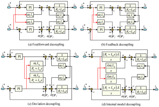 Decoupling control strategies based on scalars include feedforward decoupling [80], feedback decoupling [81], deviation decoupling [82], and internal model decoupling control technology [83]. The control block diagrams of feedforward decoupling and feedback decoupling are shown in Figure 9a and Figure 9b, respectively. The common point is that the coupling compensation term is superimposed after the current PI controllers. The given reference current is used in the feedforward decoupling control method, while the feedback current is used in the feedback decoupling control method. However, these two methods are sensitive to the motor parameters because they are based on the motor model. Therefore, it is difficult to achieve complete decoupling under parameter mismatches.
