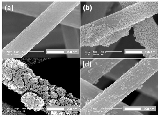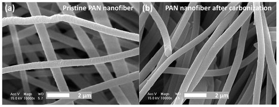 Figure 1 shows the morphologies of the PAN nanofibers after carbonization. The standard process for converting polymeric PAN nanofibers into CNFs involves oxidative stabilization in an air atmosphere and subsequent carbonization. Oxidative stabilization is essential for increasing the carbon yield and preventing the formation of hollow-core fibers during the subsequent carbonization step. Then, carbonization at high temperatures eliminates unnecessary impurities. As shown in Figure 1a, fabrication via electrospinning resulted in well-constructed nanofiber structures. Figure 1b shows that the nanofiber structure was preserved well upon carbonization, while the nanofiber surface became smoother.