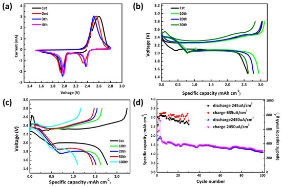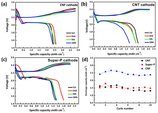 Figure 2a shows the discharge/charge behavior of the Li/catholyte/CNF cell. The first discharge curves of these cells with S-free cathodes showed only one plateau because there was no elemental S in the cells before discharge [25]. The cycling performance of the CNF/catholyte cell was stable, with an energy density of approximately 2.5 mAh/cm2.