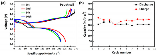 Suppression of the redox shuttle and the resulting conversion to elemental S resulted in a higher discharge capacity. Figure 4b shows the discharge/charge behavior of Li/(catholyte + LiNO3)/CNF cells. Although the rates were considerably higher (245 and 635 µA cm−2 for discharge and charge, respectively, compared to 127 µA cm−2 in Figure 3), a higher energy density of 3.1 mAh cm−2 was observed, and a relatively stable capacity profile was obtained, with 84% of the capacity being retained after 30 cycles. At a higher current density (2540 µA cm−2 or 0.4 C), the cell exhibited an initial energy density of 1.8 mAh cm−2 and retained 60% of the capacity after 100 cycles. This excellent performance was also preserved when employing a high-energy-density pouch cell. Figure 4 shows the cycling behavior of a Li/(catholyte + LiNO3)/CNF pouch cell; it delivered a discharge capacity of 230 mAh in the second cycle when the full potential was utilized after conversion to S during the first charge, and the electrode retained 80% of its capacity after 10 cycles.
