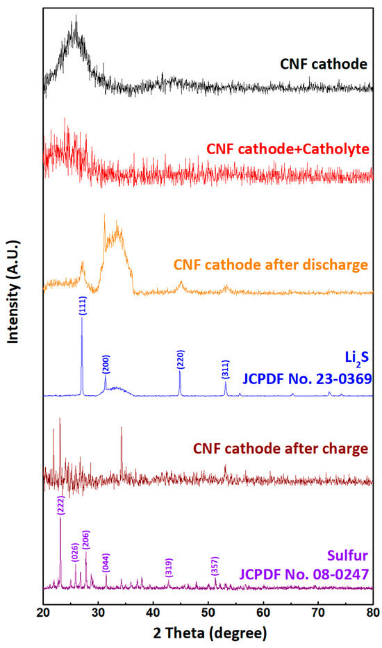 Further insight into the mechanism was obtained by analyzing the nature of the deposits through XRD experiments. Figure 6 shows the XRD patterns of the as-prepared CNF, CNF exposed to the catholyte, and cathode after discharging and charging. The XRD patterns of Li2S and S are also shown for comparison. No sharp peaks appeared in the XRD pattern of the as-prepared CNF material; rather, broad features characteristic of a material with low crystallinity or a fully amorphous material were observed. Similarly, no sharp peaks were observed for the CNF exposed to the catholyte, indicating that the deposit on the CNF surface was amorphous; however, the XRD pattern after exposure to the catholyte must be considered, as the residues of the electrolyte most likely contributed because the experiments were performed without drying the cathodes. In contrast, the XRD patterns of the cathode after charging and discharging showed sharp peaks, indicating the presence of a crystalline material on the CNF surface. The XRD pattern for the cathode after discharging was identified against the pattern for Li2S, which is the expected end-product; the peaks were rather broad, indicating the presence of a disordered structure or a small-sized crystallite of Li2S on the CNF surface. Meanwhile, after charging, the expected end product is S if the reaction is fully reversible. In the XRD pattern of the CNF cathode after charging, peaks corresponding to S were observed; however, the overall pattern was not a full match. This shows that the reaction in the cell was at least partially successful in reaching S, despite starting with Li2S8 in the initial cycle [30,31].