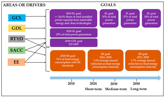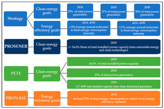 Short-, medium-, and long-term clean energy and energy efficiency goals set by the Strategy, PROSENER, PETE, and PRONASE. Source: authors’ own elaboration based on Refs. [28,29,30,31].