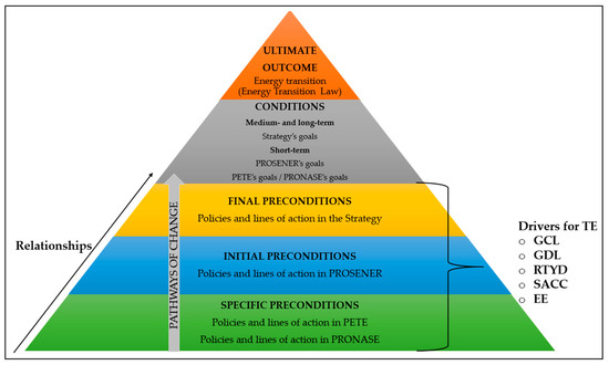 - Specific preconditions: These are at the base of the ToC’s structure, i.e., LA contained in PETE and PRONASE, classified by areas or drivers of TE. These elements are assumed as the interventions for the fulfillment of the preconditions that will in turn contribute to meet short-, medium-, and long-term goals (conditions). Due to the specific nature granted by law to PETE and PRONASE, this article assumes that there is no relationship between their LAs.