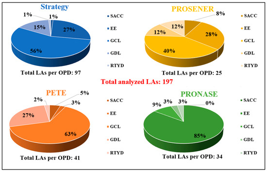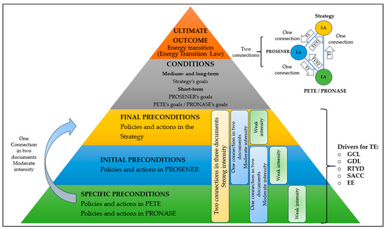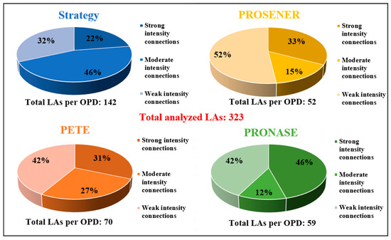 - Policies with strong intensity connections, i.e., LAs related to each other in three OPDs (two connections), namely, the Strategy, PROSENER, and either PETE or PRONASE;