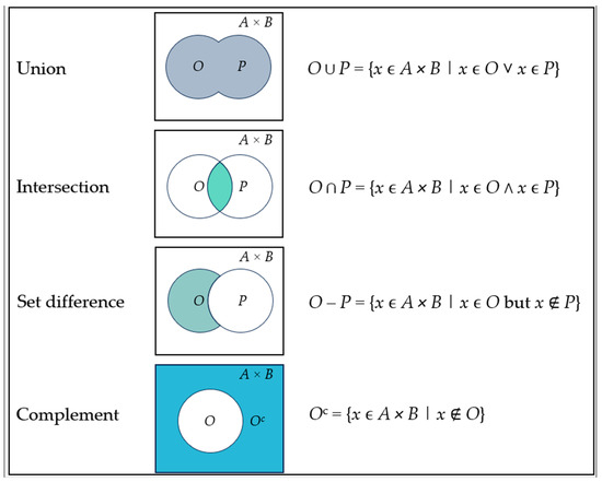 Additionally, the union (U), the intersection (∩), the set difference (–), and the complement (Sc) are operations with binary relations, where O and P are subsets of A × B and can be represented in Venn diagrams, as shown in Figure 7.
