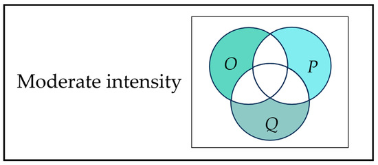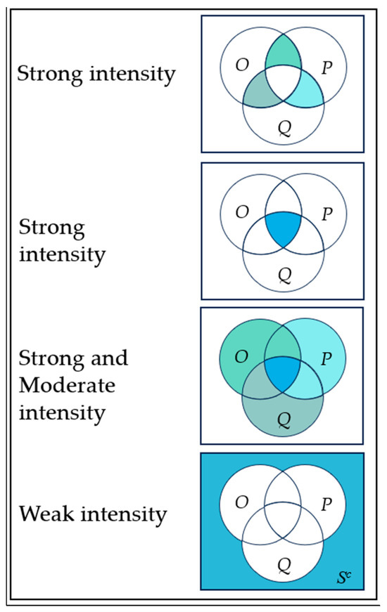 Similarly, LAs with relationships in three OPDs (3R) (Equations (11)–(14)) and in at least two OPDs (∃1R) (Equations (15)–(17)), as well as LAs with no relationship (noR) (Equations (18)–(20)) can be expressed for each OPD in Venn diagrams, as shown in Figure 9.