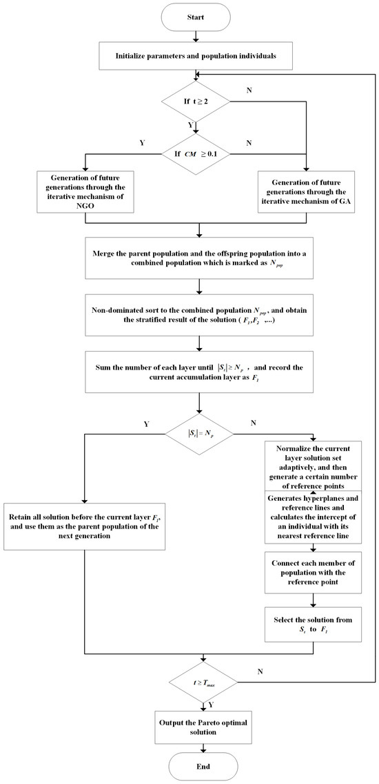 - A multi-objective optimization algorithm (NSNGO) based on the non-dominated sorting northern pale eagle high-latitude multi-objective optimization algorithm (NSNGO) is proposed, which is shown to be excellent in generating high-quality optimal solutions through a comparative analysis, and an evaluation index convergence metric (CM) for evaluating the extent of the global search/local search is also proposed, which is capable of reflecting whether or not the algorithm has sufficiently explored the search space.