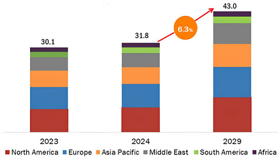 In response to these challenges, smart operation technologies for gas fields, often referred to as digital oil field (DOF) technologies, are actively being developed [6]. These technologies leverage information and communications technology (ICT) to enhance production efficiency and safety by utilizing data collected from sensors attached to various facilities [7,8]. Additionally, the oil and gas industry is increasingly exploring the application of machine learning based on big data, with AI techniques being employed for tasks such as fluid flow analysis in reservoirs and pipelines, production forecasting, and optimal network design [9,10]. The market research firm Markets and Markets predicts that the DOF industry will grow at an average annual rate of 6.3%, reaching approximately USD 43 billion by 2029 (Figure 1).