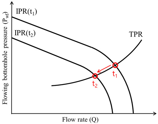 When production occurs through multiple wells, the reservoir pressure continuously declines [20]. The pressure drop pattern for each well varies due to the formation’s heterogeneity and fluid properties, leading to changes in production capacity over time [21]. Variations in permeability and porosity of the reservoir cause uneven pressure depletion, gradually shifting the IPR curve downward as reservoir pressure decreases. Additionally, as gas composition changes or condensates form, the pressure-flow relationship adjusts, leading to further shifts in the IPR curve. This can be expressed through the IPR, which mathematically represents the relationship between reservoir pressure and flow rate and shows how the flow rate changes according to various flowing bottomhole pressures (FBHP) [22,23]. In gas fields, the IPR typically displays non-linear characteristics, as shown in Figure 2. Natural flow conditions can be determined at the intersection of the IPR and the tubing performance relationship (TPR) [24]. In Figure 2 it can be observed that the IPR curve shifts leftward and downward over time due to the reduction in reservoir pressure from production, explaining the decline in output over time as a shift in the intersection point.