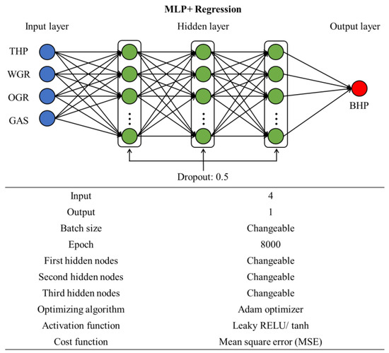 Machine learning in this study was performed using TensorFlow 1.12.0, a Python-based library developed by Google [34,35]. The learning process proceeded as follows: first, parameter ranges were selected for each well and pipeline, resulting in an average of 80,000 datasets per flowline. Various techniques were then examined to identify the optimal AI learning approach for training on the VFP tables. Recurrent neural networks (RNNs) were excluded from this study since the data points were independent and non-sequential. Instead, the study compared the learning accuracy of three methods: Multilayer perceptron (MLP) + Regression, Autoencoder + Regression, and Support vector regression (SVR). The variables used for each method, such as flow rate, pressure, and other operational conditions, and the structure of the neural networks are shown in Figure 4, Figure 5 and Figure 6.