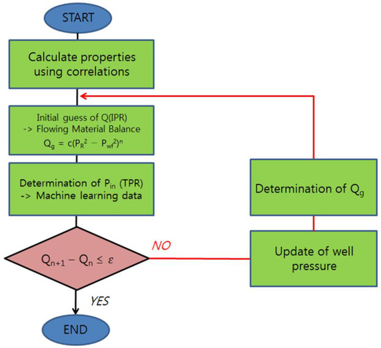 In this study, we developed a production forecasting model for the entire production system by combining flow prediction models which were trained using IPR, DMBE, and machine learning techniques with yield distribution methods. The flowchart for this process is shown in Figure 8.