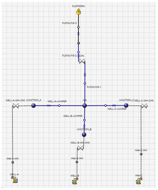 Schematic of PIPESIM simulation model for offshore gas wells and pipeline network.