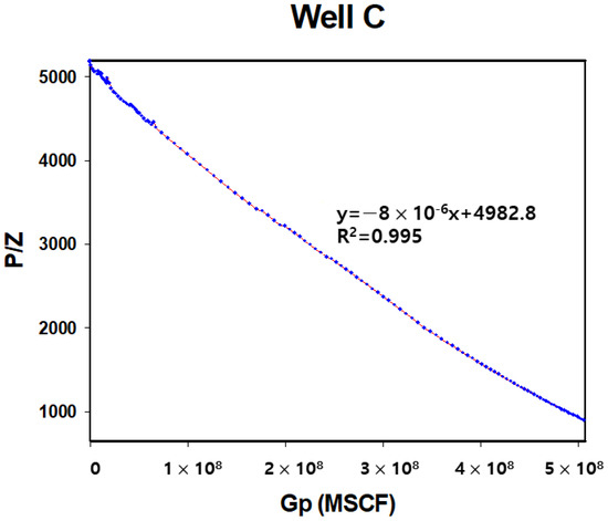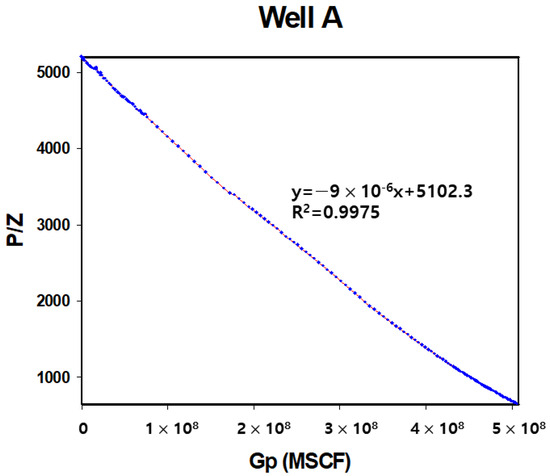 As previously mentioned, as production continues, the IPR curve shifts downward and to the left as reservoir pressure decreases, changing the intersection between the IPR and TPR over time. Since the IPR curve represents inflow-performance behavior at a specific point in time, linkage analysis with the material balance equation (MBE) is required to simulate the changing production capacity of oil wells over time [27]. The MBE treats the reservoir as a single tank and analyzes the average pressure, reserves, and productivity of the reservoir based on the conservation of mass for fluids entering and leaving the tank [28]. For gas fields, the MBE is a function of average reservoir pressure and cumulative gas production (Gp, SCF), and it incorporates the gas compressibility factor (z). This relationship is shown in Figure 3 and Equation (5), where it is represented as a linear function of p/z and Gp [29]. The average reservoir pressure can be derived from shut-in pressure recovery data during production stoppages.