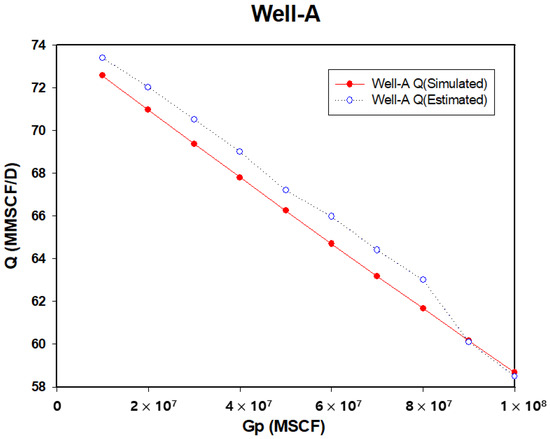 Figure 15 and Table 5 show the comparison between simulated and estimated flow rates for Well A. As observed, the predicted flow rates closely match the simulated values, with only minor deviations across the production period. The trend line indicates that the flow rate steadily decreases from an initial rate of approximately 72 MMSCF/D to 58 MMSCF/D as cumulative gas production increases. This decline in flow rate is consistent with the reservoir depletion expected over time, which behavior the model captures accurately with minimal error.