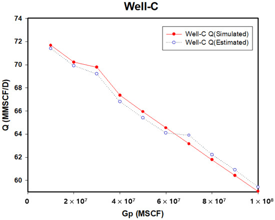 Figure 17 and Table 7 illustrate the same comparison for Well C, where the flow rate begins at 71 MMSCF/D and declines to around 59 MMSCF/D. The estimated values are almost identical to the simulated results, demonstrating the model’s high precision in predicting the production performance of this well.