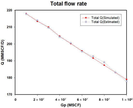 Figure 18 and Table 8 consolidate the flow rates for all three wells, showing the combined simulated and estimated flow rates. The total flow rate starts near 218 MMSCF/D and decreases to 183 MMSCF/D. The strong alignment between the simulated and predicted values across all wells highlights the model’s overall accuracy and its potential applicability for predicting total production in complex gas fields.