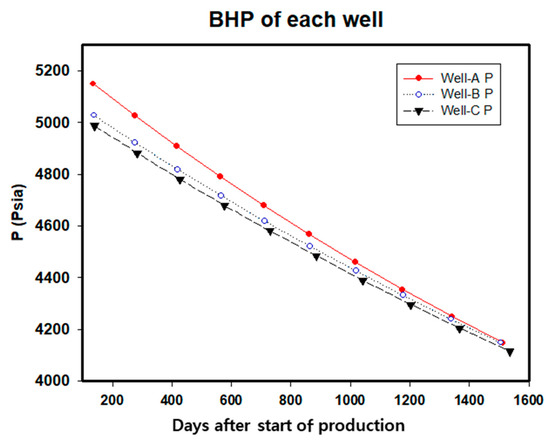 Estimated bottomhole pressure (BHP) trends of each well change over time.