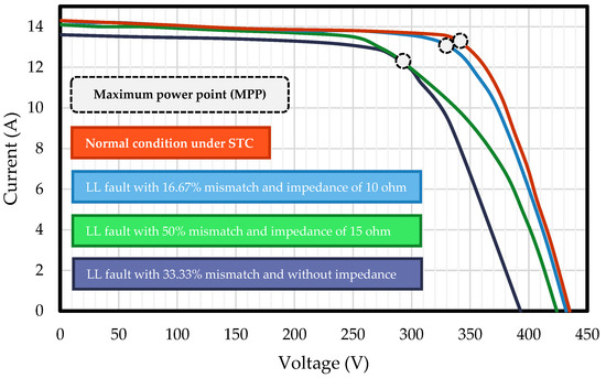 Additionally, Figure 2 demonstrates the PV array I–V curve in normal conditions and various LL fault scenarios. It emphasizes that LL faults have a similar impact on the I–V curve under low mismatch levels and high impedance values compared to normal conditions, making it challenging to distinguish faulty conditions.