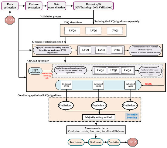 The k-means clustering algorithm does not assign values directly to the weight vectors of the LVQ algorithms. Nevertheless, the result of the K-means clustering algorithm can be utilized as a starting point for initializing the weight vectors in the LVQ algorithms [30]. Applying K-means clustering to initializing weight vectors of the LVQ algorithms begins with randomly initializing k centroids C1, C2, C3, …, Ck. Next, each data point xi is assigned to the nearest centroid based on the Euclidean distance defined in Equation (17). Then, each centroid Cj is updated to be the mean of all points assigned to cluster j based on Equation (18), where Sj is the set of points assigned to cluster j. These steps are repeated until the centroids no longer change or change very little. Following this, the majority label of the data points assigned to cluster j is determined by Cj based on Equation (19), where yi represents the label of data point xi. The process then moves on to initializing the LVQ weight vectors with the centroids Cj and their corresponding labels, marking the beginning of the learning process. During the learning process of LVQ, the weight vector and their labels are utilized. For each data point xi with label yi, the closest weight vector is first identified based on Equation (7). Then, the weight vector is updated according to whether the label matches, as defined in Equations (8) and (9). These steps are repeated for a predefined number of epochs or until the weight vectors converge. The cluster centroids acquired from the K-means clustering algorithm are employed as initial vectors for the LVQ algorithms. Each cluster centroid can be viewed as a representative vector for the data samples in that specific cluster.