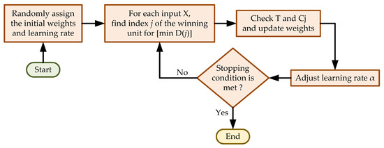 Step #2: The square of the Euclidean distance is calculated for every weight vector (j = 1, …, m) and input vector element (i = 1, …, n). As shown in Equation (7), calculating the Euclidean distance involves comparing the input vector components (xi) with the corresponding weight vector components (wij). The algorithm’s decision-making process is centered around the winning unit in j, which is the weight vector with the minimum distance D(j). This winning unit is significant, as it represents the weight vector that is the closest match to the input vector, thereby influencing the subsequent steps of the algorithm.