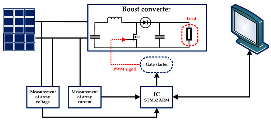 The configuration depicted in Figure 1 showcases an efficient standalone PV array setup. This proposed system comprises PV modules, blocking diodes, bypass diodes, combiner boxes, a DC–DC converter, ground fault detector interrupters (GFDIs), and OCPDs, all working harmoniously. In Figure 1, each PV module is equipped with a bypass diode, which helps maintain PV performance. It comprises three parallel strings, each containing six modules connected in series. The efficient arrangement of the PV arrays through a combination of series and parallel connections ensures the achievement of the desired voltage and current levels (and, subsequently, the desired output power).