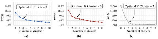 It is important to mention that the optimal number of clusters is determined using the elbow method, calculating the within-cluster-sum-square (WCSS) metric as defined in Equation (20).