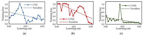Next, the AdaGrad method is utilized to determine the most optimal learning rate. Figure 10 illustrates the training loss of LVQs within the range from 0 to 0.02 of the learning rate, with the lowest learning rates being LVQ1 0.01, LVQ2 0.02, and LVQ3 0.02, respectively. The AdaGrad optimizer has identified the most optimal learning rates.