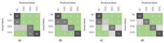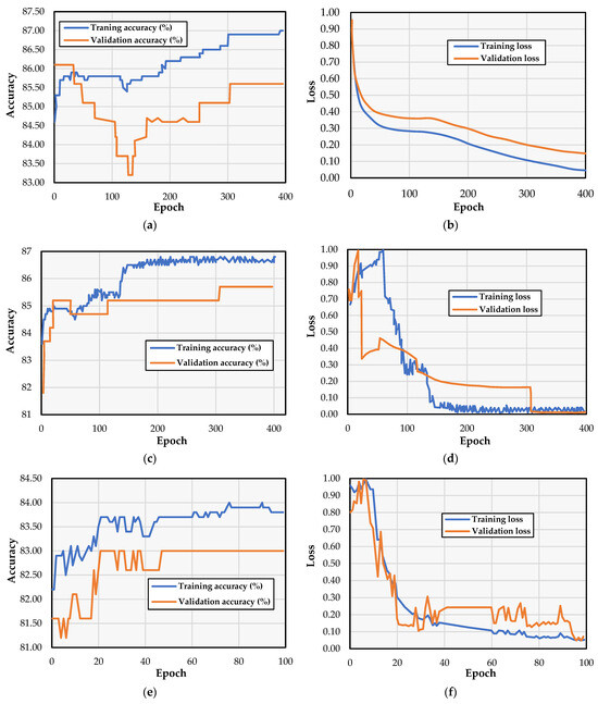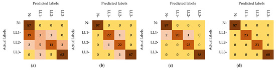Furthermore, Figure 13 shows the validation confusion matrices, providing a comprehensive summary of the validation results. It demonstrates the accuracy of the final model during validation by detailing the number of correct and incorrect classifications using different learning methods. Furthermore, Table 6 provides information on three additional evaluation metrics: precision, recall, and F1 score, which can be calculated from each confusion matrix using Equations (26)–(28).