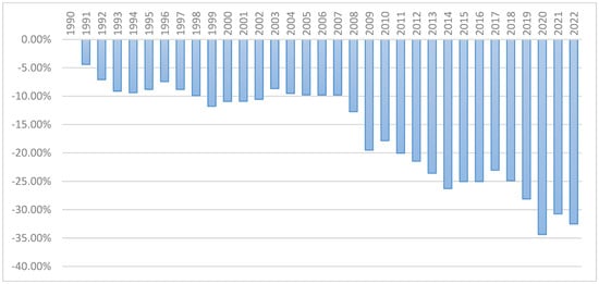 Confronted with climate change pressure, the European Union has driven its targets to mitigate and adapt to climate risks, as stated by the Paris Agreement in 2015. Achieving climate neutrality by 2050 [] will require a tremendous shift in development to become more sustainable and fairer for all. The European Green Deal highlights the EU strategy for a green and just transition path []. Transformations in economies, including industrial and productive structures, are required to organize their potential in a net-zero direction to enhance the economy–environment nexus and impact. An important aspect of this transition is linked to how emerging states and developing nations will be able to increase their resilience and capacity to develop within a framework that focuses on reducing greenhouse gas emissions. The task of cutting emissions by 55% by 2030 [] will be implemented by adopting various instruments, such as regulations, climate-friendly innovation adoption, and sustainable finance. The aim of reducing greenhouse gas emissions is being progressively implemented, as seen in Figure 1, which shows the annual decrease in emissions from 1990 to 2022. Still, the EU-27 remains fourth among the top greenhouse gas emitters, according to Climate Watch [].