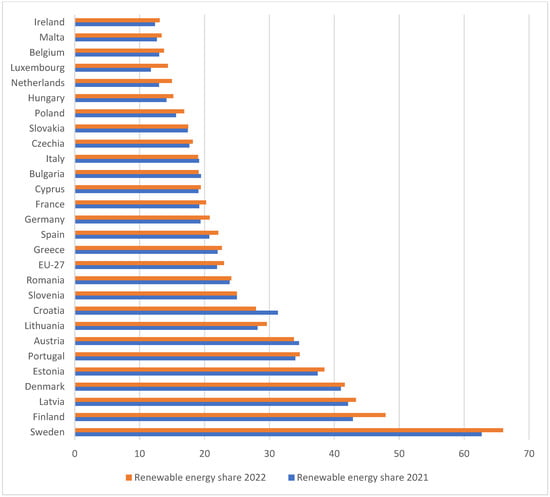 Renewable energy consumption in EU−27, 2021–2022. Source: Eurostat, https://ec.europa.eu/eurostat/databrowser/view/NRG_IND_REN/default/table?lang=en (accessed on 11 July 2024).