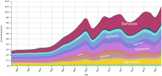 Europe product exports, 1995–2021. Source: downloaded from https://atlas.cid.harvard.edu/explore/stack?country=4&year=2021&queryLevel=group&startYear=1995&productClass=HS&product=undefined&target=Product&partner=undefined (accessed on 11 July 2024).