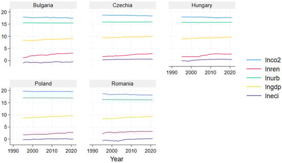 This study used four independent variables (including control): renewable energy consumption, urbanization, economic growth, and the economic complexity index to test the impact on European carbon emissions. Carbon emissions were used to measure pollution and environmental damage levels in the assessed countries. Renewable energy consumption was chosen as the main indicator of environmentally friendly behavior and is one of the most relevant targets of the European Green Deal for sustainable development. Additionally, a country’s innovative and technological development is reflected by its economic complexity level. Furthermore, as the control variable, the study used urbanization (acknowledged in the literature as having an important impact on the environment) and economic growth (appreciated as being directly linked to a state’s economic potential). All variables are presented in Table 2. Figure 4 highlights the evolution of analyzed variables over time. It can be observed that the countries included in the panel have comparable evolutions, being a homogeneous group with similar characteristics.