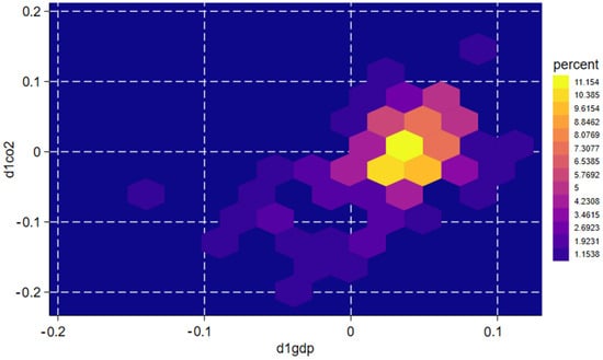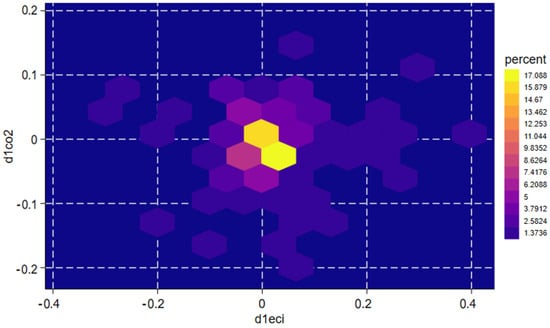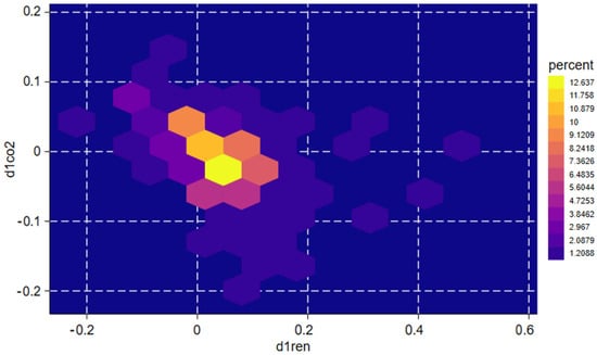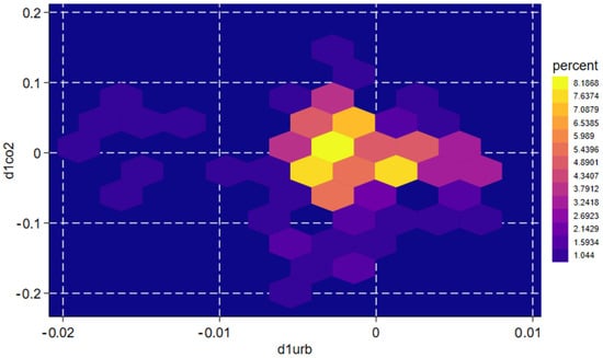 In Table 3, we present descriptive statistics for all the variables analyzed. Figure 5, Figure 6, Figure 7 and Figure 8 provide hexagon plots for variable interaction. We can easily observe that carbon emissions have evolved from 36 million to 377 million. Additionally, renewable energy consumption has increased over the years, and countries have grown from 3% to 24.40%. Moreover, the urban population increased over time by almost five times, while the economic complexity index ranges from 0.35 to 1.84, with a mean of 1.08 over the panel.