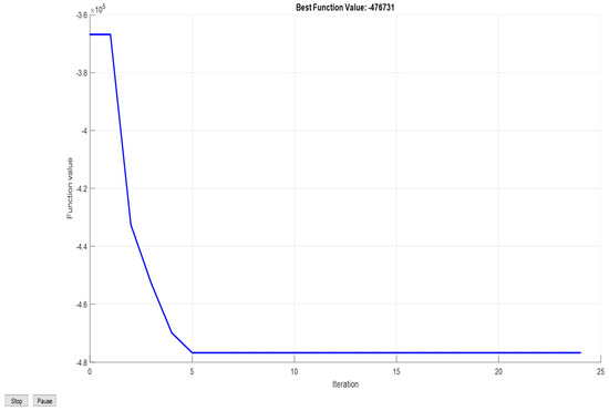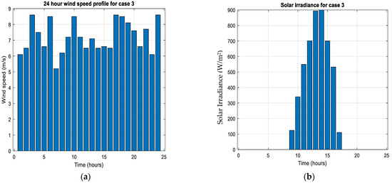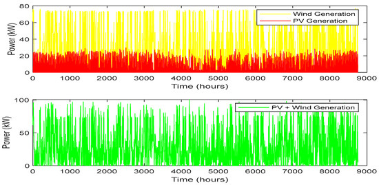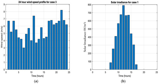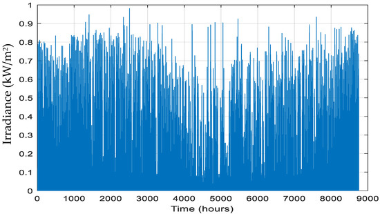 G(t) represents the hourly solar irradiance at the site, as shown in Figure 1. The area of the panel is denoted by (A) (1 m2), and (η) is the solar panel efficiency (20%). In this study, it is assumed that the PV modules are equipped with a maximum power point tracking (MPPT) system, and temperature effects are disregarded. If (x(1)) is the number of PV modules to be optimized, the total PV power can be calculated as follows: