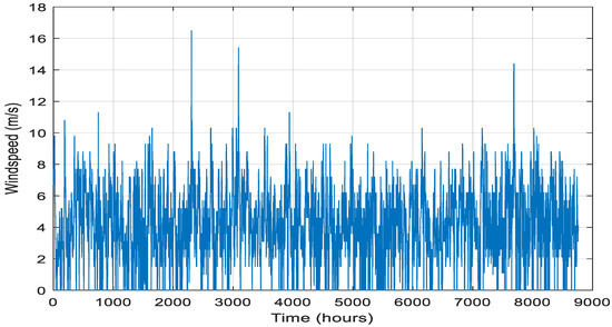 In this study, (v) represents the wind speed at the wind turbine’s hub. (Vc) is the cut-in speed, (Vr) is the rated speed, and (Vf) is the cutoff speed. The wind turbine has a rating of 25 kW, with a rated speed of 3 m/s and a cut-in speed of 2 m/s. The conversion of the measured wind speed at a given height to the turbine hub speed is performed using the power law.