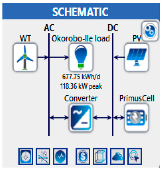 Figure 12 shows the Homer model for optimization. The winning solution consists of 166 kW PV panels (Generic flat plate PV), three wind turbines (Eocycle EO25 Class III), 29 batteries (20 kW–72 kWh Primus Power Energy Cell) and 123 kW converter.